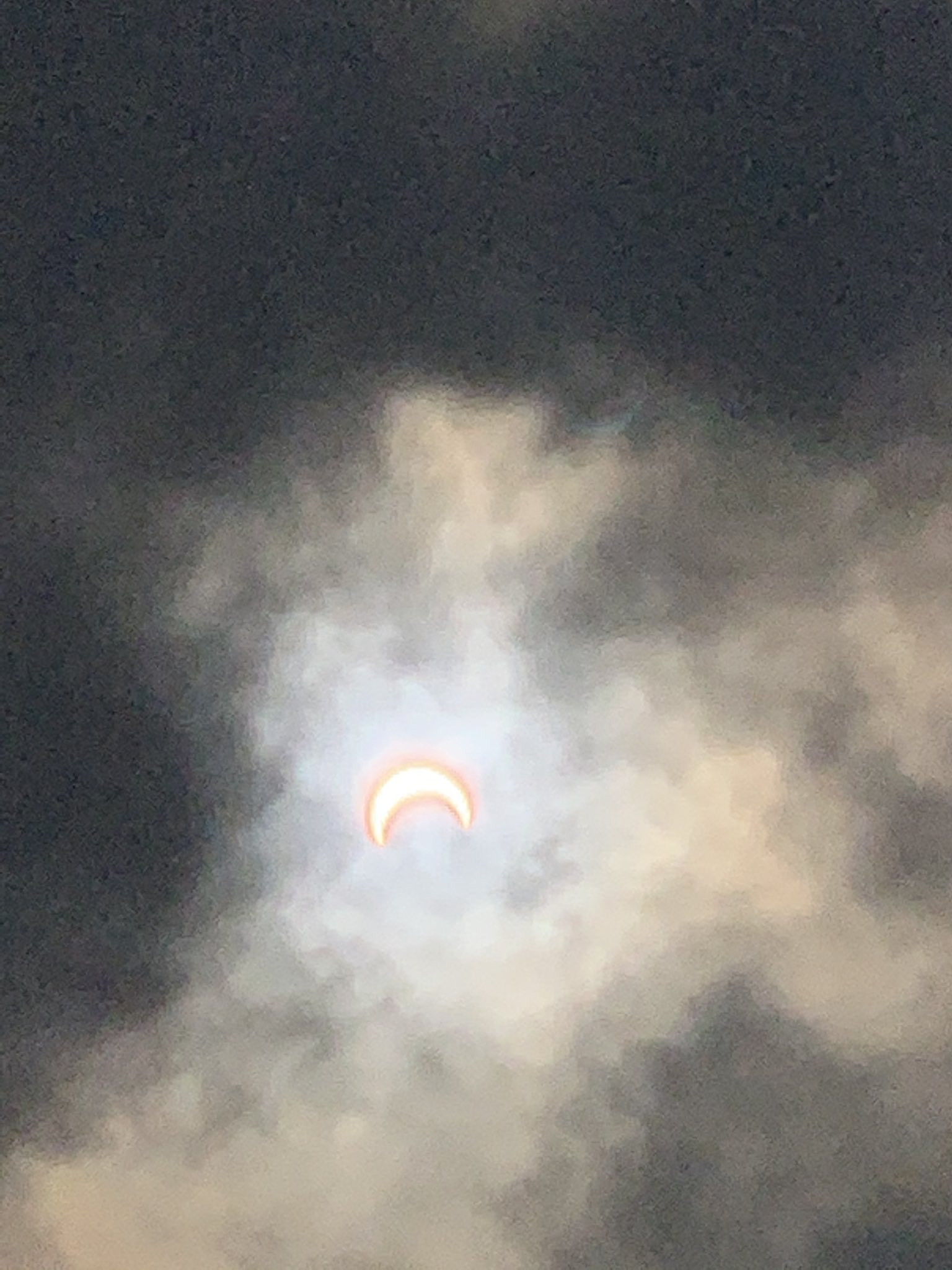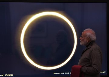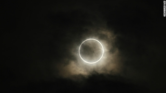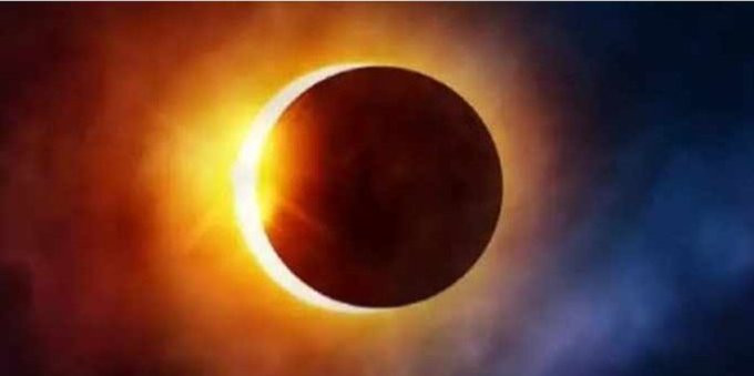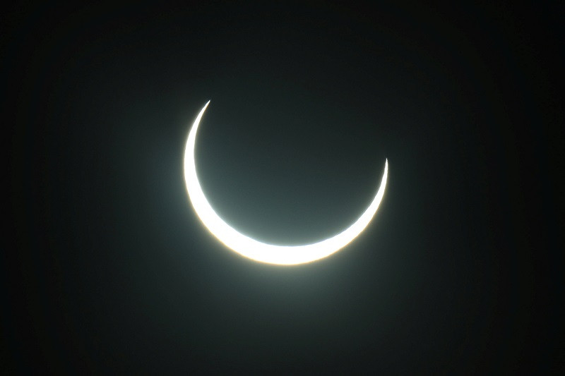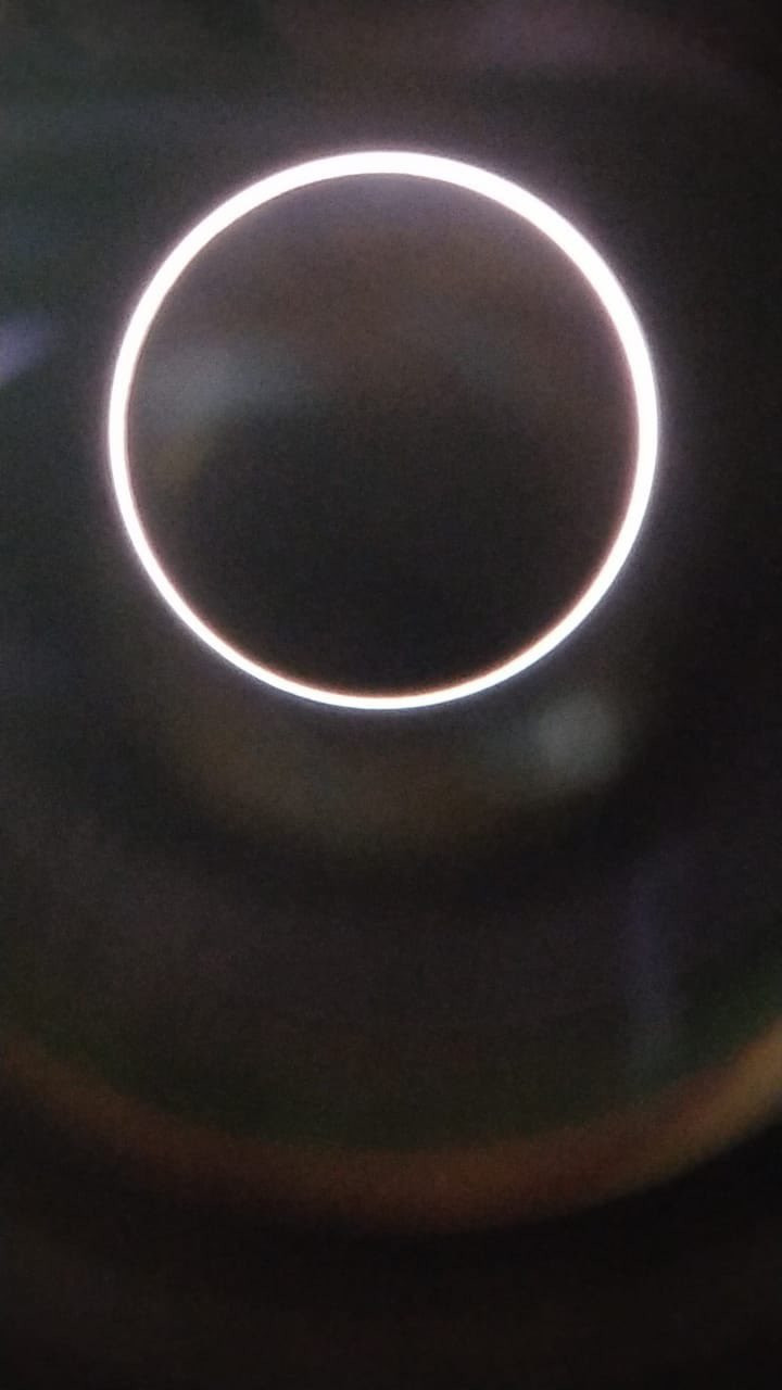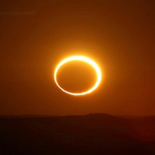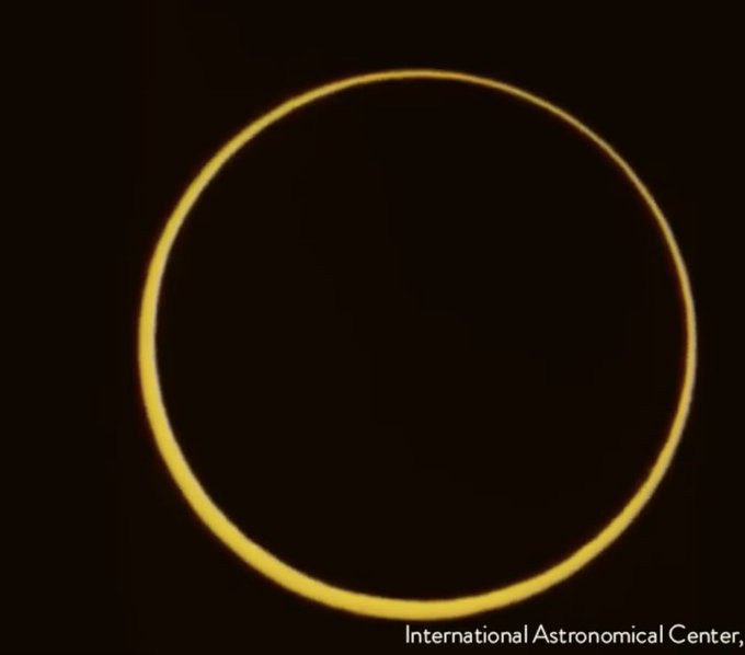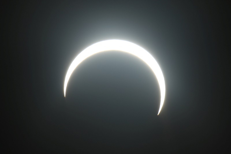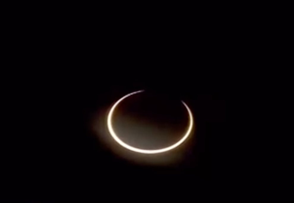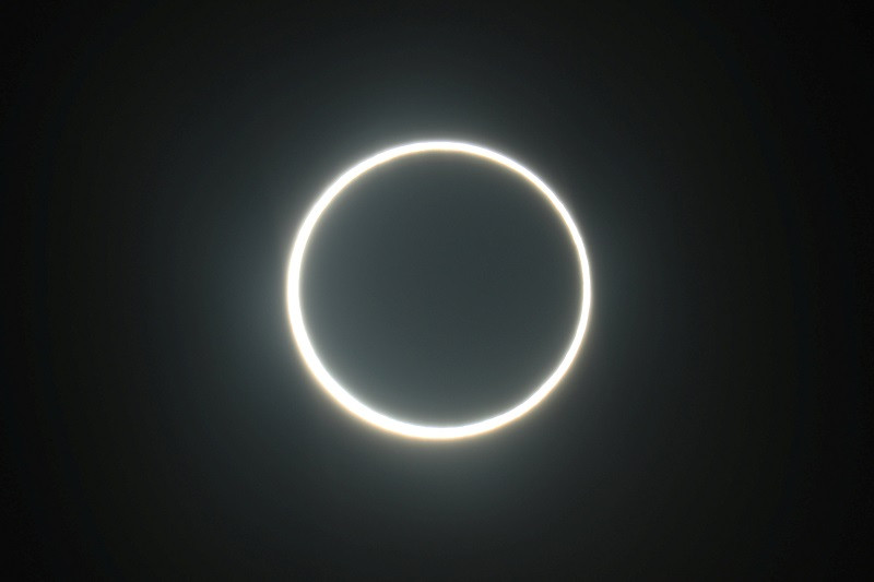 रिङ अफ फायरमा पूरै चन्द्रमाले सूर्यलाई ढाक्ने तर त्यसको वरिपरिबाट प्रकाश देखिन्छ।
