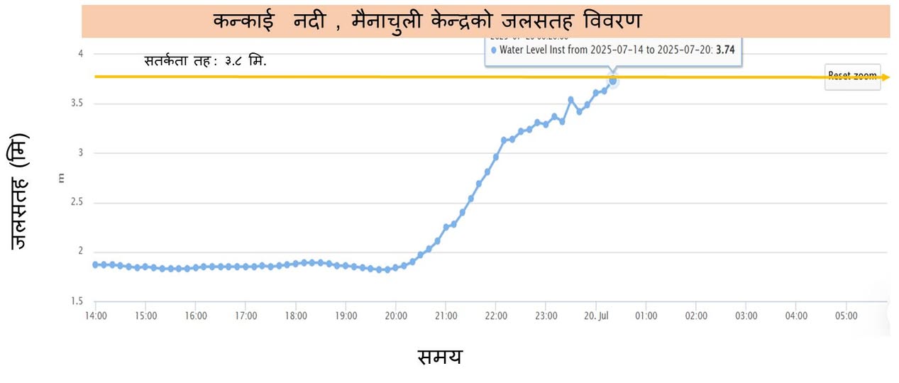 इलाम : इलाम जिल्लाको कनकाई र मैनाचुली जल मापन केन्द्रमा शुक्रबार बिहान ५ः३० बजे लिइएको विवरणअनुसार नदीको जल सतह सतर्कता तहको आसपासमा पुगेको छ ।