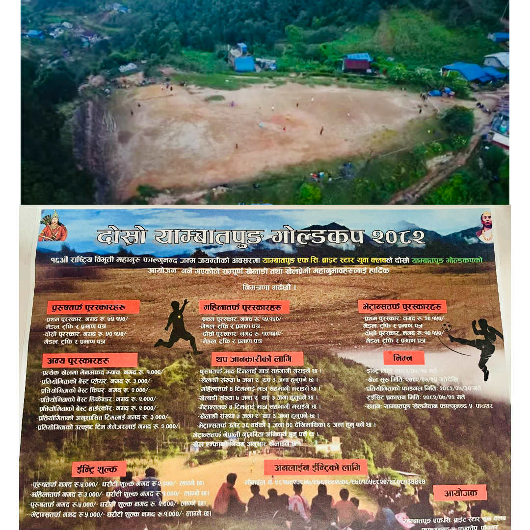 पाँचथरः पाँचथरको फाल्गुनन्द–५, फाक्तेपस्थित याम्बातपुङ खेलमैदानमा ‘दोस्रो याम्बातपुङ गोल्डकप’ खुला नकआउट फुटबल प्रतियोगिता कार्तिक २५ गतेदेखि सुरु हुने भएको छ। राष्ट्रिय विभूति महागुरु फाल्गुनन्दको १४१औँ जन्मजयन्तीको अवसरमा २५ गतेदेखि शुरु हुने पुरुष तथा महिला खुला नकआउट फुटबल प्रतियोगिता ३० गते सम्पन्न हुनेछ।