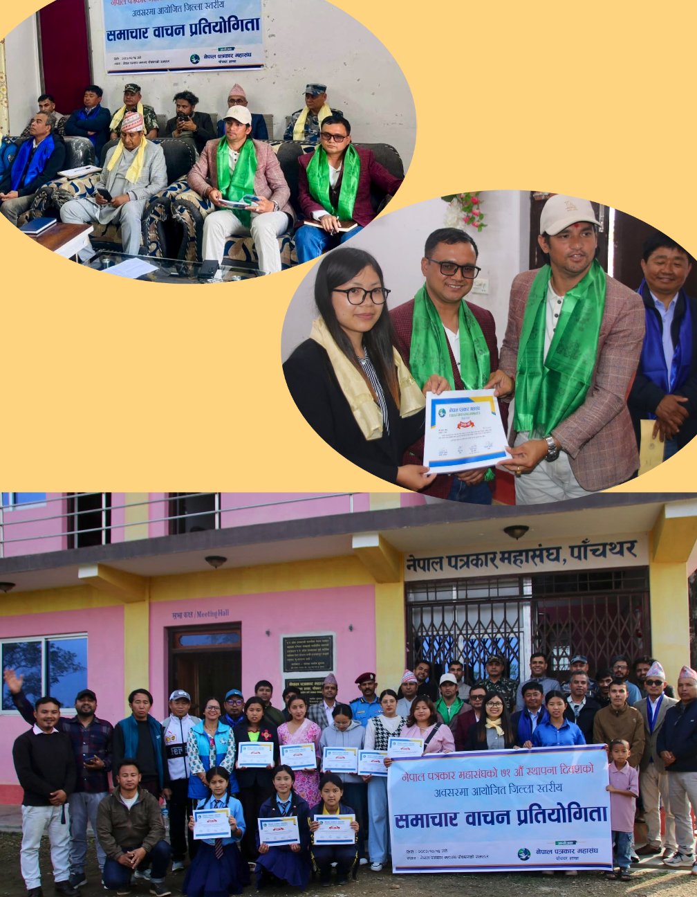 पाँचथरः नेपाल पत्रकार महासंघको ७१ औँ स्थापना दिवसको अवसरमा महासंघ पाँचथर शाखाले सोमबार फिदिममा समाचार वाचन प्रतियोगिता आयोजना गरेको छ। युवापुस्तामा समाचार लेखन तथा वाचनप्रति रुचि अभिवृद्धि गर्ने उद्देश्यले आयोजित प्रतियोगितामा २२ जना प्रतिस्पर्धी सहभागी भएका थिए। प्रतियोगितामा पत्रकार इवारा जबेगूले उत्कृष्ट प्रस्तुति दिँदै प्रथम स्थान हासिल गरिन्। उनले सात हजार रुपैयाँ नगदसहित प्रमाणपत्र प्राप्त गरिन्। यस्तै, कमल घिमिरे द्वितीय हुँदै पाँच हजार रुपैयाँ नगद र प्रमाणपत्रबाट सम्मानित भए भने भीम चेम्जोङ तृतीय स्थान हासिल गर्दै तीन हजार रुपैयाँ नगदसहित प्रमाणपत्र प्राप्त गर्न सफल भए।
